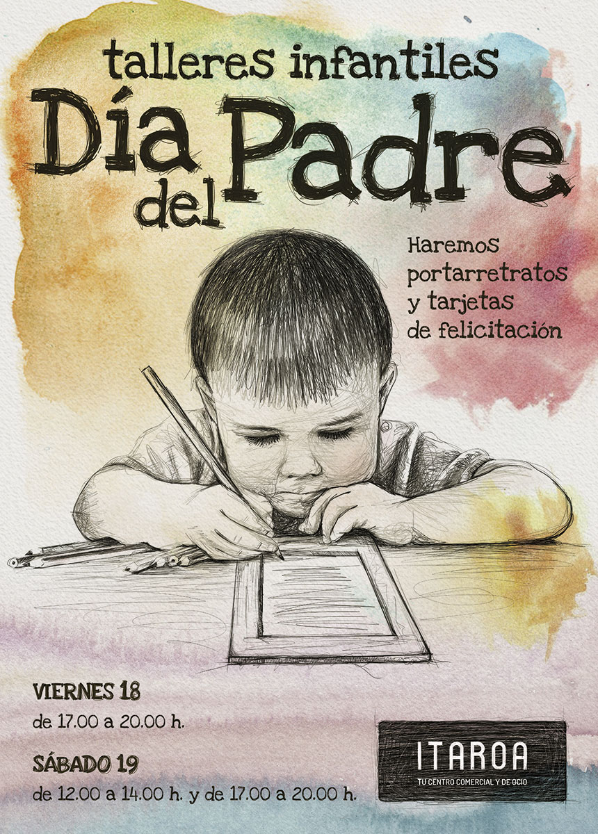 Ilustración y diseño de cartel para promocionar actividades infantiles en el centro comercial Itaroa durante el Día del Padre.